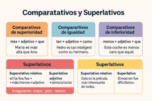Em Espanhol, usa-se comparativos para estabelecer relações de igualdade, superioridade ou inferioridade e superlativos para destacar o grau máximo de uma qualidade. Esse tema aparece em descrições, diálogos e redações no DELE B1.