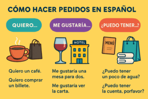 Objetivo: Utilizar expressões práticas para fazer pedidos de forma simples, educada e natural em espanhol, em contextos cotidianos como restaurantes, lojas ou serviços.