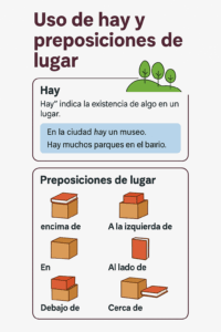 Nesta lição, você aprenderá a falar sobre o que existe em um lugar e a descrever a localização de pessoas, objetos e estabelecimentos. O verbo hay é fundamental para indicar existência (“há”, “tem”), enquanto as preposiciones de lugar ajudam a explicar onde algo está situado.