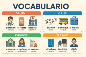 Objetivo: Aprender e praticar vocabulário relacionado à saúde, viagens, estudos e trabalho para interações do cotidiano e situações comuns do exame DELE B1.